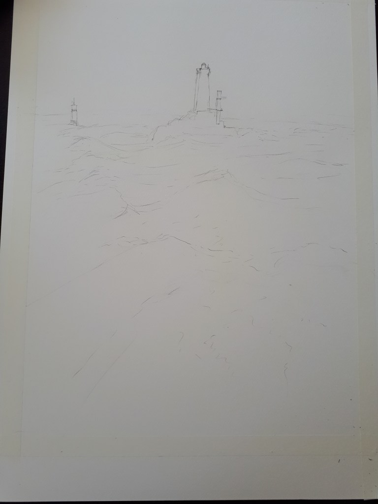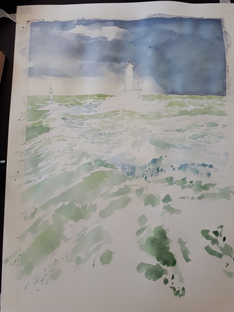 C’est parti pour un pas à pas d’aquarelle en quelques étapes. Le sujet : le phare de la vieille et et sa conserve, la Plate. Le sujet n’est pas facile, on fait un grand format, (raisin).