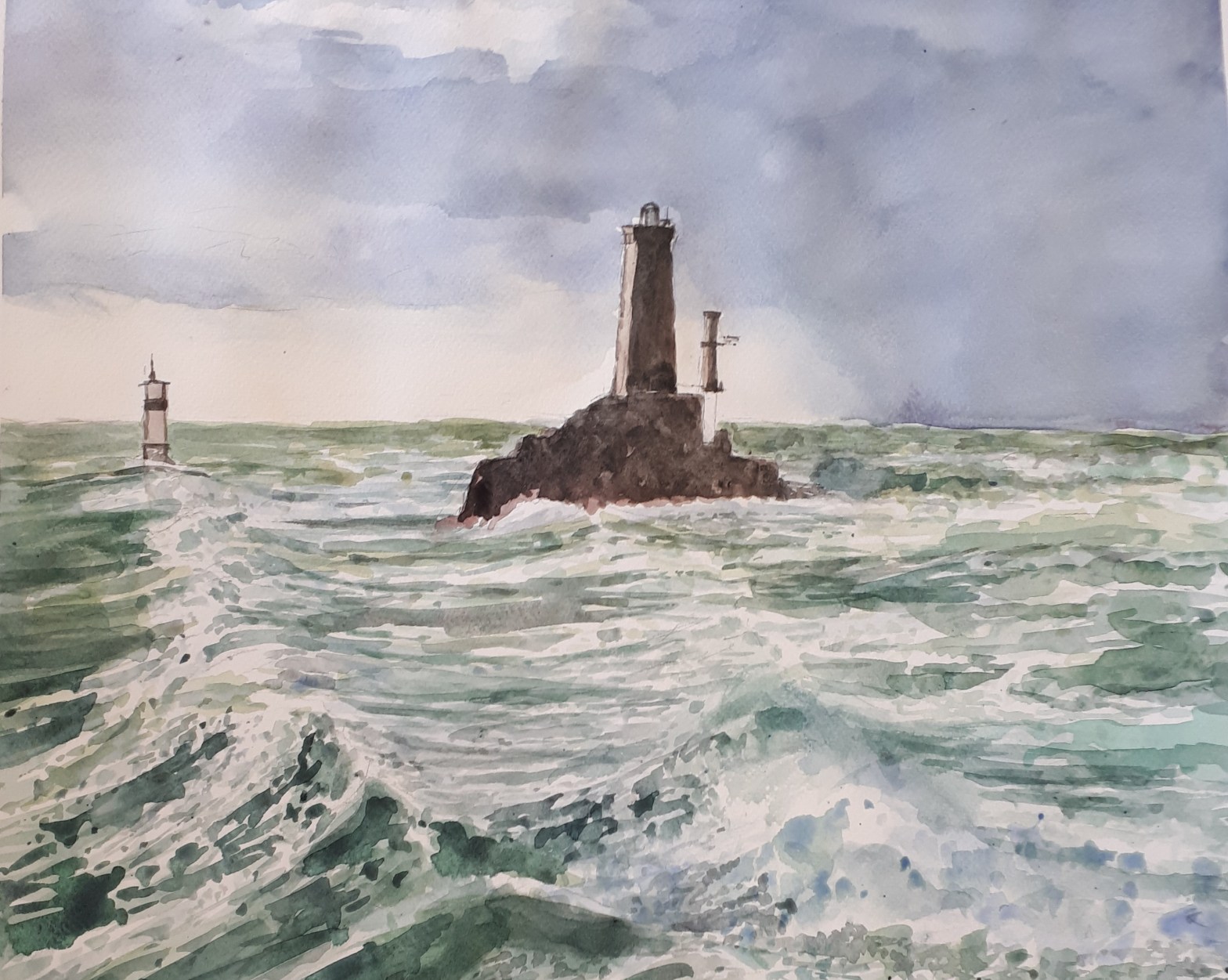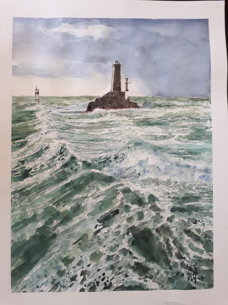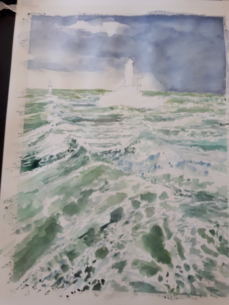 L’étape la plus intéressante, le glacis. Il faut continuer à soutenir les verts, mélangés de noir pour contraster les vagues et donner du relief. Le phare est peint, noir, terre de sienne, rouges. La plate, en arrière plan, tout juste esquissée. La difficulté est de savoir s’arrêter pour ne pas perdre l’effet aqua de l’aquarelle.