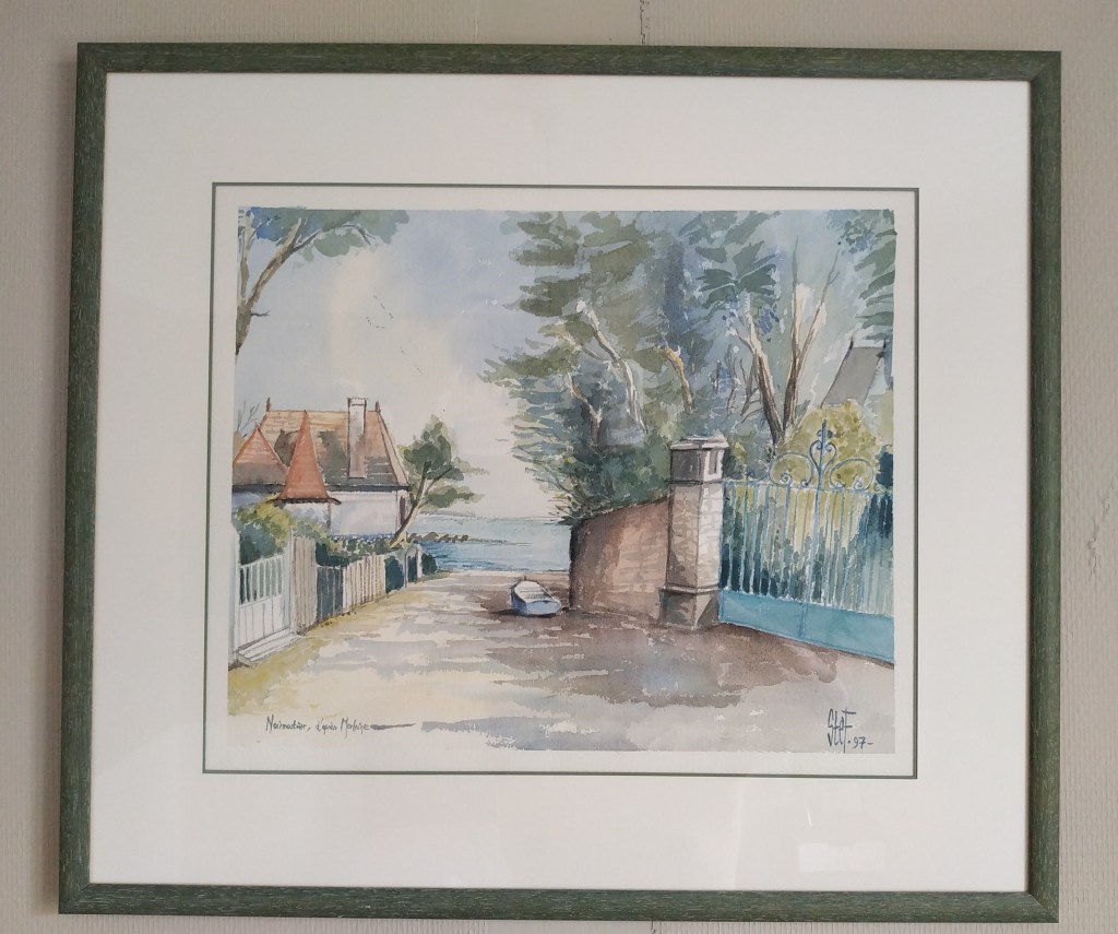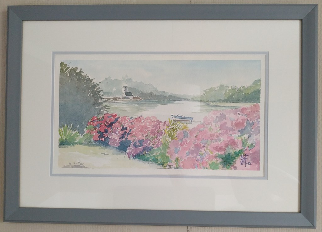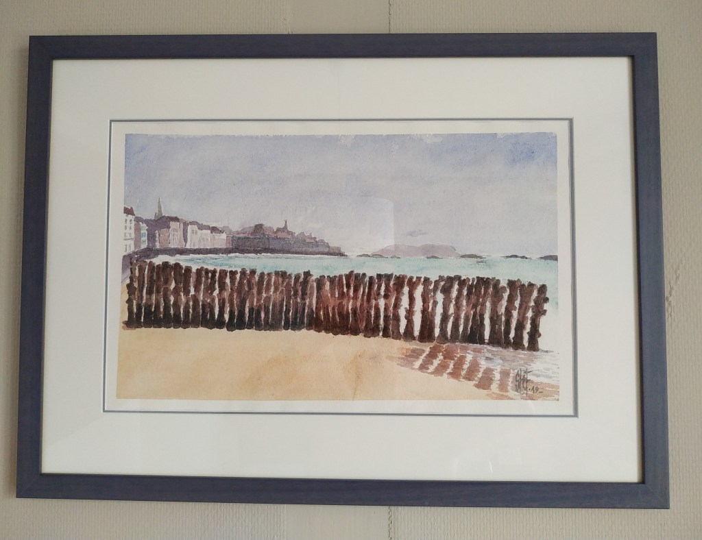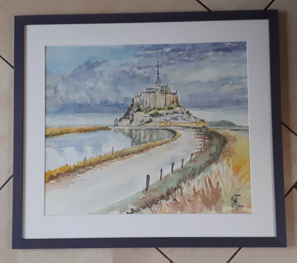 Pour le phare, on choisit une baguette large, passe partout coquille d’oeuf. Le Mont Sait Michel aura, lui, une baguette plus fine, couleur bleue/mauve irisée, passe partout blanc. J’ai hâte de voir le résultat sur deux grands formats. On approche le 50×70. Cela faisait longtemps que je n’avais pas utilisé ce format. Je l’apprécie beaucoup. Ces deux aquarelles vont donner un bel effet.