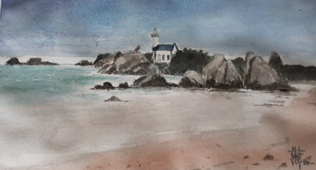Pour le ciel, classique, une couleur de fond avec terre de sienne et jaune. On laisse sécher un peu, puis on attaque avec le bleu, mélange de bleu outremer, rouge. On laisse une petite réserve de blanc en haut à gauche pour la trouée. Sur la mer, les premières couleurs claires de fond. Un camaïeu de verts. Le phare sera peint en dernier. Je n’utilise pas de drawing gum ici, il faut donc réserver les blancs et faire attention.