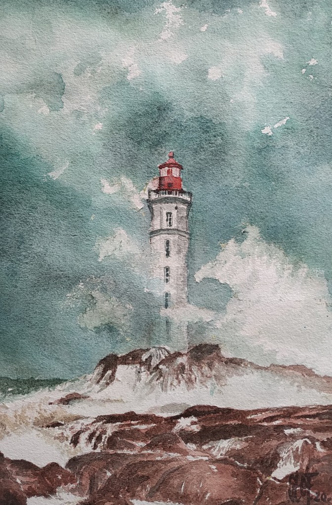 L’étape la plus intéressante, le glacis. Il faut continuer à soutenir les verts, mélangés de noir pour contraster les vagues et donner du relief. Le phare est peint, noir, terre de sienne, rouges. La plate, en arrière plan, tout juste esquissée. La difficulté est de savoir s’arrêter pour ne pas perdre l’effet aqua de l’aquarelle.