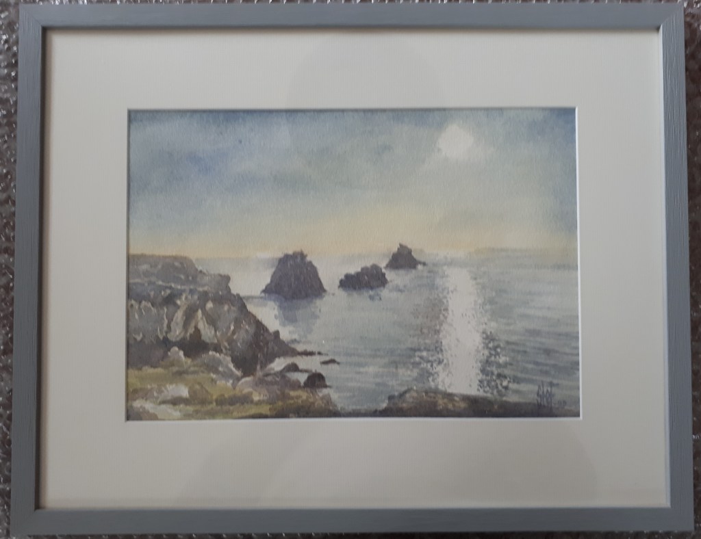 Pour la pointe de Pen Hir, même démarche, on a choisi pour cette aquarelle, une baguette mauve clair.