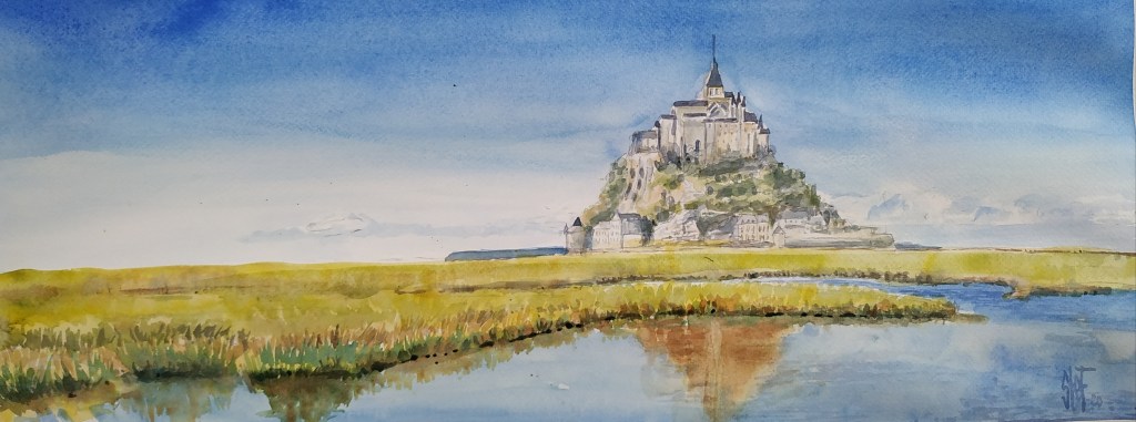 On poursuit avec le Mont Saint-Michel vu sous un nouvel angle. J’ai bien aimé réaliser cette aquarelle car le format est intéressant. Le ciel est bien dégagé, l’avant plan marécageux. Très sympa avec ces couleurs ocres et vertes de l’herbe sauvage et, bien sûr, le Mont en réverbération sur l’eau des marais.